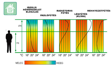 a felületfűtés- és hűtés választására a legjobb komfort kínálata. Az ember közérzete attól függ, hogy milyen a környezetéből felvett és az oda leadott hőmennyiség egyensúlya. Amennyiben több a leadott hő, akkor fázunk, ha pedig több a felvett hő, akkor melegünk van. A leadott hő nagymértékben a környezetünktől függ, persze más egyebektől is, mint pl. munkavégzés, ruházkodás [9]. Ha a környezetünk hőmérséklete alacsony, akkor sok hőt sugároz az emberi test arrafelé. Ha viszont nem kell az embernek hőt sugároznia a környezete felé, akkor akár alacsonyabb levegőhőmérsékletnél is jó a közérzete, sugárzási egyensúly alakul ki. A magasabb padlóhőmérséklet viszont a láb izzadását, gombásodását, sőt belső szervi problémákat is okozhat. A többi hőleadóhoz képest a felületfűtések biztosítják a legegyenletesebb léghőmérsékletet, vízszintes és függőleges irányban, így a hőérzet is egyenletes.